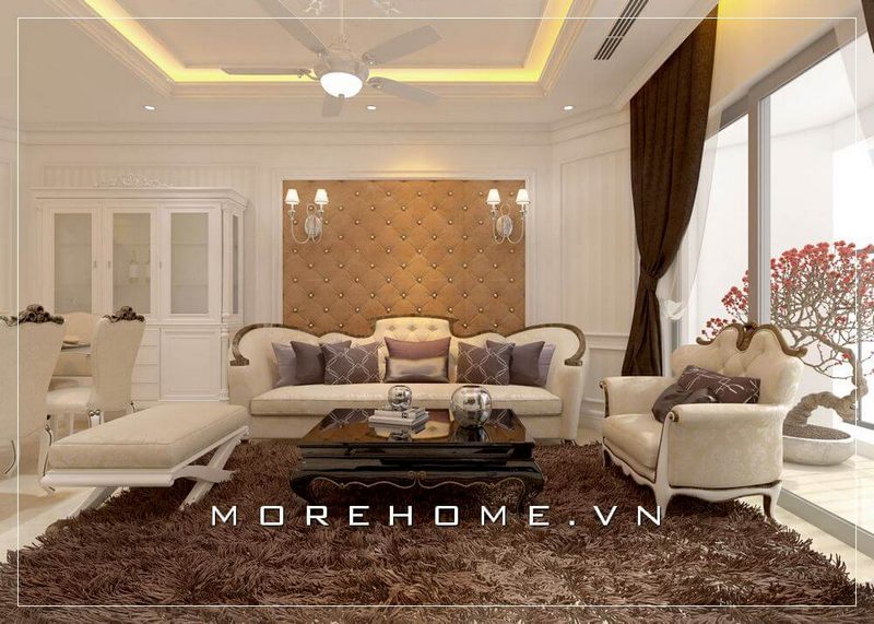 Nội thất phòng khách của chung cư tân cổ điển sử dụng hai tone màu chủ đạo là trắng và vàng nâu nhẹ giúp tạo nên sự hài hòa và ấn tượng tuyệt vời cho khu vực tiếp khách của gia chủ.